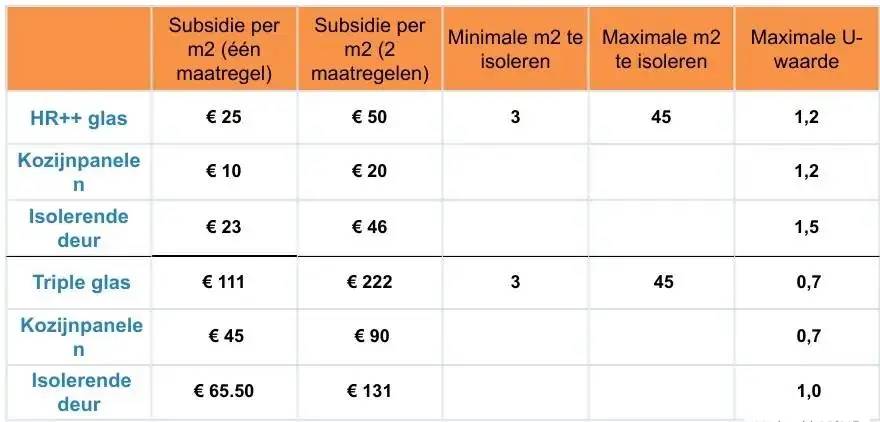 Zoals te lezen is, kunt u ook subsidie krijgen voor isolerende deuren, kozijnpanelen en HR++ glas. Let wel op, kozijnpanelen zijn geen kozijnen. Enorm verwarrend, maar dit zijn de isolerende platen die vaak onder het glas worden bevestigd. Wel is het een verplichting dat met het plaatsen van triple glas ook isolerende kozijnen worden geplaatst. U mag dan de vierkante meters kozijn optellen bij het dubbel of triple glas. Hierover kunt u meer op de website van de overheid lezen. Dit levert u al snel extra subsidie op.