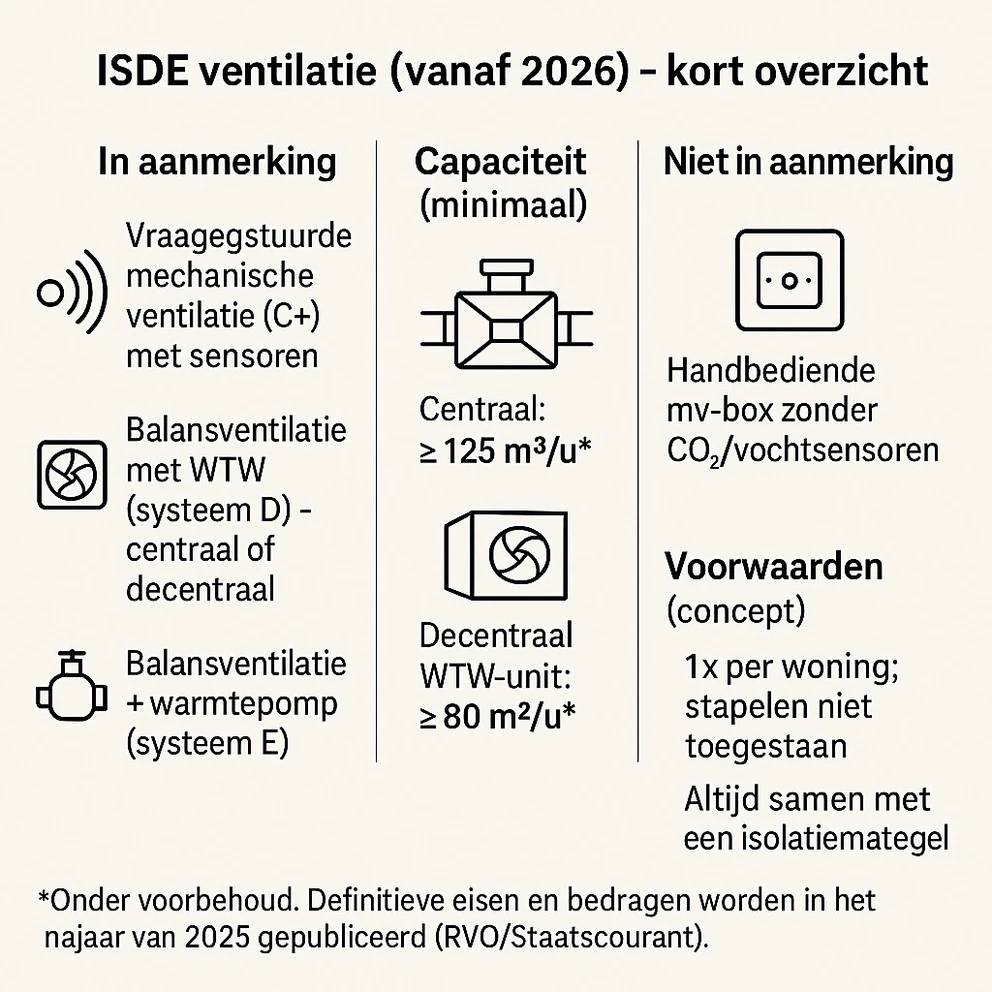 Ventilatie subsidie 2026. De ISDE subsidie 2026 is aankomend jaar aangevuld met een nieuwe categorie, namelijk de ventilatie subsidie. Het energiezuinig ventilatiesysteem staat al tijden op de lijst om toegevoegd te worden aan de ISDE subsidie. Het lijkt in 2026 te gaan gebeuren. In dit blogbericht meer informatie over deze subsidiekans en wat de verwachtte voorwaarden zijn